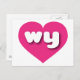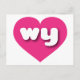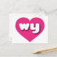This postcard features a vibrant hot pink heart containing the bold, white, rounded lower case letters wy, a playful abbreviation for Wyoming, the cowboy state. The reverse side of the postcard is blank, awaiting your customised text or handwritten sentiments.