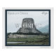 A digital painting of the Devils Tower and a herd of bison grazing near a river, with trees scattered at the base of the geological tower and rolling hills in the background. This is not a real landscape scene in Wyoming. This painting was made based on two of my photographs. In white lettering, across the centre of the painting is, "Wyoming". At the top corners is the state motto, "Equality State", and the statehood year, "1890". The painting has a dark blue border. Image Copyright ©2023 Kimberly J Tilley.