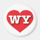 This magnet features a vibrant red heart containing the bold, white, upper case letters WY, the official abbreviation of Wyoming, the cowboy state.
