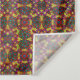 A vibrant, kaleidoscopic pattern features intricate geometric shapes in red, yellow, blue, green, and purple. The repeated motifs create a sense of symmetry and movement, resembling a colourful mosaic or stained glass design.