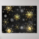 Black Christmas background with gold and black jewellery snowflakes. Golden snowflakes. Xmas.