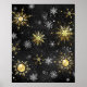 Black Christmas background with gold and black jewellery snowflakes. Golden snowflakes. Xmas.