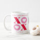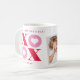 A modern Happy Valentine's Day Mug with red and pink XOXO with hearts inside and two photos! Give as a gift filled with candy or coca to friends or family members.