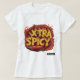 A playful and fun t-shirt design featuring the words "X-tra Spicy" in a cartoon font, surrounded by fiery red flames and chilli peppers. This design is ideal for spice enthusiasts with a sense of humour.