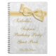 Elegant Surprise Birthday Party guest book for any age. XXth Surprise Birthday Party! Beautiful white damask pattern background with a pretty, stylish romantic gold bow and ribbon image. These glamourous, classy guest books are perfect for women and teenage girls and are decorated / printed on the front side only. Teenagers and adults alike will love this chic modern surprise party guest book. Can be used for any age:- 17th 18th 19th 20th 21st 30th 40th forty 50th fifty 60th sixty 70th seventy 80th eighty 90th ninety 100th one hundred. PLEASE NOTE: All products on Zazzle have flat printed images. Bow and ribbon images purchased from digital-designs-by-elena. If you need any assistance customising your product please contact me through my store and I will be happy to help.