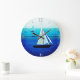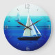 Clock in semi abstract, minimalist poster art of a yacht at sea, on a cobalt and cerulean blue ocean background