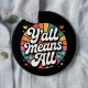Spread love and acceptance with this retro style 'Y'all Means All' design featuring a groovy rainbow script and sunburst.