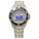Has heft and feel of expensive stainless steel quartz watches. Good band with safety catch. I removed links, which is easy because engraved arrows show direction to push the linking pins. As always by this seller, the image (a railroad logo) is a perfect reproduction of my emailed image, and is precisely spaced and aligned.