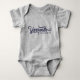 This baby bodysuit features the text Yarmouth, Massachusetts in a navy blue nautical font. A minimalist design that boasts the name and state of the Cape Cod town.
