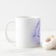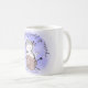 Whimsical coffee mug for yarn lovers! Features illustration of cute girl on top of yarn ball with knitting needles, watercolor blue background and "yarn makes my world go 'round" text.