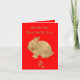 Beautiful Chinese New Year greeting card done in bright red, with graphics of a golden rabbit and the symbol for rabbit under it. New years greetings in Mandarin and Cantonese is done in gold, on the top of the card. The character Fu or Fook meaning fortune or luck is traditionally displayed upside down on New Years Cards as the symbol inside the card is done.