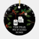 Fun & humourous holiday ornament to mark the end of 2020. Our design features our hand-drawn festive toilet paper ornaments hanging from a pine tree branch decorated with berries. The ornament features a fun typographic saying "2020 The year we stayed home". Personalise with family signature and family members' names as well as the year. Artwork by Moodthology Papery
