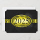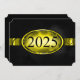 Floral designs surrounding button on top of a yellow ribbon that has floral designs. Black cloudy background. The back of the card has a black background with yellow lettering for the graduation announcements.