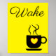 This poster is black and yellow with a pop of red on the heart with the text, "Wake," with a graphic of a coffee cup. Modern sleek look will add a pop of colour to your kitchen.
