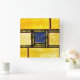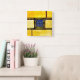 This square wall clock features an abstract design created from photos of a stained glass church window, in blue and yellow with brown and green accents.