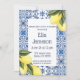 The zest is yet to come with this lemon and blue porcelain themed shower invitation! A frame of vintage blue porcelain and lemon plants surrounds a fun and feminine text for a look that is fit for your next bridal shower, wedding shower, or baby shower! This invitation is the perfect combination of vintage, rustic and modern with it's blue and white Spanish porcelain style frame complete with fresh and cheery lemons making it the perfect addition to your next event!
