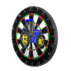 Fun time dart board in red white and black. This dart board Is for the gaming room with dramatic flair. With a Yellow and blue tractor on it.