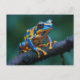 A striking digital painting of a yellow and blue tree frog perched on a tree branch. The frog's vibrant yellow body is adorned with bold blue markings, making it stand out against the deep jungle foliage. Its glossy skin reflects soft light, giving it a lifelike, almost three-dimensional appearance. The background features blurred tropical greenery, adding depth and emphasizing the frog as the focal point.