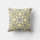 Throw pillow with an ornate pattern in light yellow, navy blue, and white. Detailed and intricate scrollwork design.