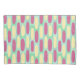 This cloth placemat has a geometric design of made of a background of sea-green and light blue rectangles with yellow and pink ovals on top.
