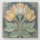 An Art Nouveau-inspired tile with a relief of yellow and white lotus flowers with green leaves on a dark blue background, the tile has a decorative border with floral motifs.
