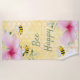 Yellow, white background with a honeycomb pattern. Decorated with pink tropical florals flowers, hibiscus and happy bumble bees. The text: Bee Happy. Green hand lettered text. Perfect for your summer home, beach house or vacation home!