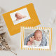 Celebrate the arrival of your little bundle of joy with our yellow and beige striped birth announcement photo cards. The farmhouse style birth announcements display your baby's photo on the front with a background of skinny yellow and beige linen stripes. Personalise the front of the announcements by adding the baby's name and birth information (birth date, length, weight, etc.). The simple boy birth announcement reverses to feature an additional photo with space for a message in white text with a golden yellow background.