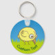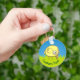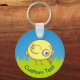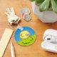 A cute and funny yellow bird cartoon on grass and sky background. Custom text on both sides.