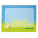 A cute and funny yellow bird cartoon on grass and sky background. Custom text.