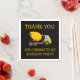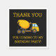 Yellow and black cement mixer truck child's birthday party "thank you" paper napkins. Text says, "Thank you for coming to my birthday party"