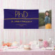 A banner that celebrates a PhD graduate with words and a picture. This minimalist design is yellow and blue. The photo is a template that is meant to be swapped out for your own. All the words and both colours can be customised.