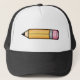 This hat features a cute yellow cartoon pencil illustration with a pink eraser on top.