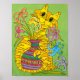 This mischievous yellow striped cat simply cannot resist playing with this colourful, ornate vase full of beautiful pastel lilies. Sitting with her tail wrapped around the vase, she has pulled out a purple lily, which is lying at her feet, and is proudly holding another irresistible piece of the once-carefully-arranged bouquet, an unusual blue lily, in her mouth.
