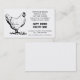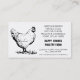 A simple black and white artoon style drawing of a chicken, most likely a layer hen, adds the perfect touch to this simple chicken hatchery business card. Four customizeable text areas on the front side allow you to personalise it to suit your chicken operation or poultry producing business. Great for live product sales such as hatching eggs, chicks, pullets or cockerels etc or off farm egg sales.