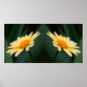 Striking yellow daisy flower close up against a dark green background mirror abstract. Flower photography by Susan.