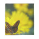 Close up of the head of a yellow daisy, also known as Helenium, with a Lasiommata Megara (Wall or Wall Brown Butterfly) feeding on the pollen