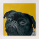 Black pug on a yellow background