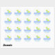 A cute little yellow duck with a blue bow and a cute expression. A soft blue border with white dots.