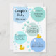 Stylish baby shower invitation done in white with graphics of blue, aqua, mint green, and turquoise bubbles and little yellow rubber duckies. Personalise the black text, inside the bubbles, for your baby event. Fun invitation for the parents-to-be.