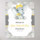 Yellow Elephant Peanut in a winter hat and scarf with rustic wooden background and snowflakes - perfect welcome sign for a gender neutral baby shower.