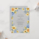 This design features a cheerful and bright aesthetic perfect for a seasonal outdoor ceremony. A palette of sunny yellow and cool periwinkle blue pops against a sophisticated slate gray background. Lush watercolor illustrations of yellow roses, lilies, and vibrant blue hydrangeas create an elegant composition. Delicate greenery and soft foliage add a botanical touch to the artistic arrangement.