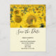 Save the date postcard with a beautiful photograph of a field of yellow sunflowers.