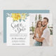 This modern floral wedding Save The Date card features a classy and elegant bouquet of yellow watercolor roses, complemented with delicate greenery and accented with golden leaves (faux gold) over a plain white background on the left side, while the right side is customisable with one of your favourite engagement pictures.