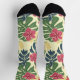 A cheerful red and pink floral pattern with large green and blue monstera leaves against a soft yellow background.
