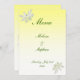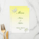 This lovely yellow floral wedding menu just glows with the joy of the occasion. The front is decorated with white daffodils set on a sunny golden yellow gradient. A gorgeous bouquet of daffodils, narcissus and white lilacs decorates the back. All text can be customised to suit your individual occasion.