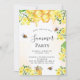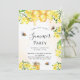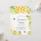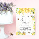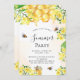 A summer party invitation with a white and golden watercolored background. Decorated with bumble bees, melting honey and honeycomb with yellow florals, flowers and a honey jar. Personalise and add a name and party details. Golden and black letters. Perfect for a summer or fall party