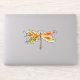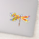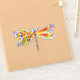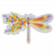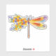 Artistically painted, floral dragonfly in contrasting orange and purple with yellow, bright, blooming California poppy and blue wildflowers on white background.