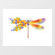 Artistically painted, floral dragonfly in contrasting orange and purple with yellow, bright, blooming California poppy and blue wildflowers on white background.