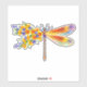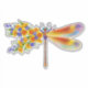Artistically painted, floral dragonfly in contrasting orange and purple with yellow, bright, blooming California poppy and blue wildflowers on white background.