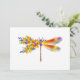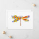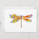 Artistically painted, floral dragonfly in contrasting orange and purple with yellow, bright, blooming California poppy and blue wildflowers on white background.